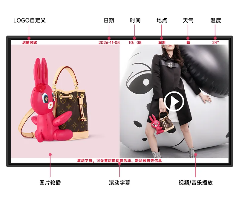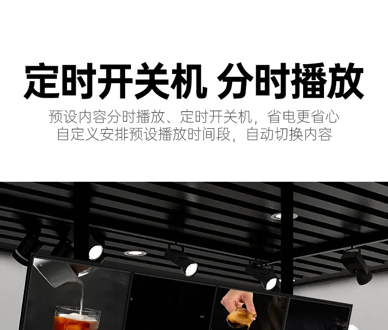 特色优势:高清显示、信息查询、远程管理、用户管理、紧急插播、横竖屏、自定义分屏、定时开关机、多点触控、运行内存大