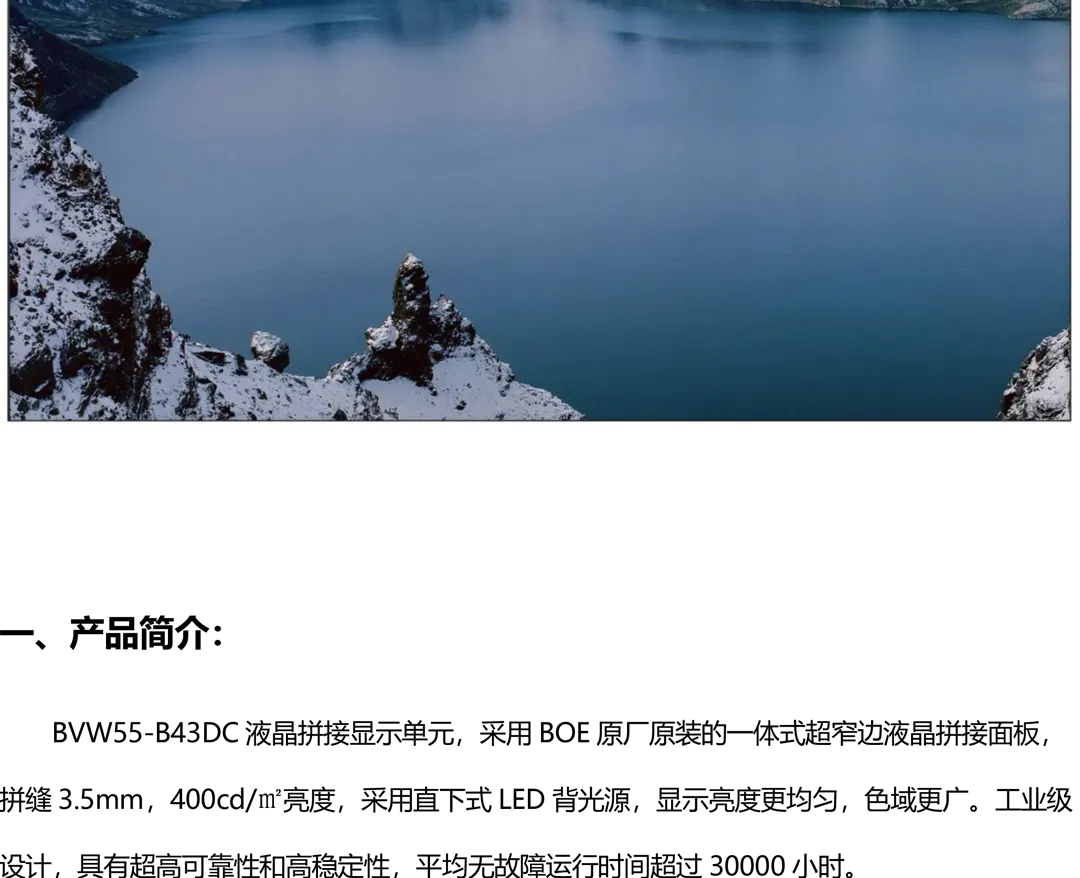 产品特点:采用BOE原厂原装的一体式超窄边液晶拼接面板,拼缝3.5mm,400cd/㎡亮度,采用直下式LED背光源,显示亮度更均匀,色域更广。工业级设计,具有超高可靠性和高稳定性,平均无故障运行时间超过30000小时。