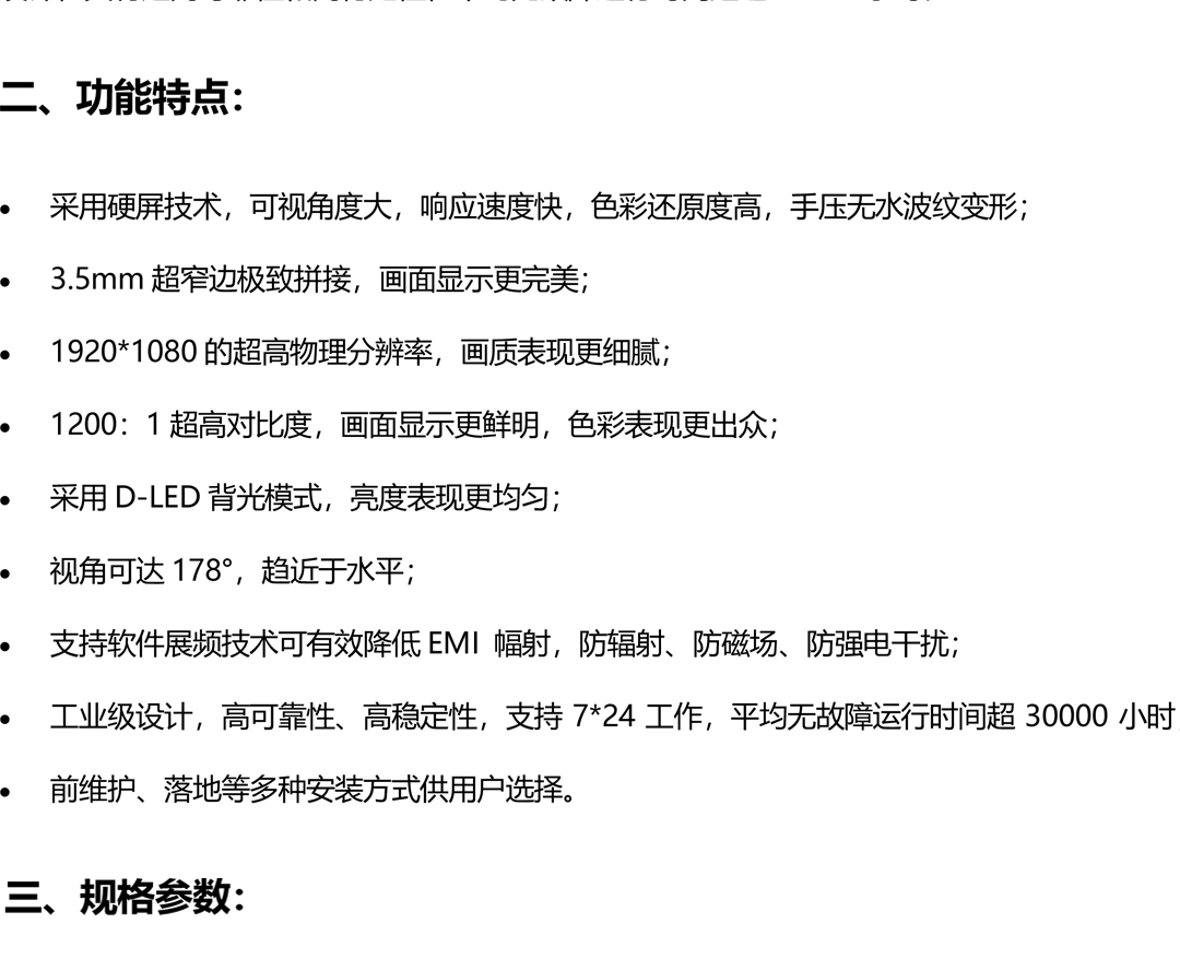 特色优势:采用硬屏技术,可视角度大,响应速度快,色彩还原度高,手压无水波纹变形; 3.5mm超窄边极致拼接,画面显示更完美,1920*1080的超高物理分辨率,画质表现更细腻